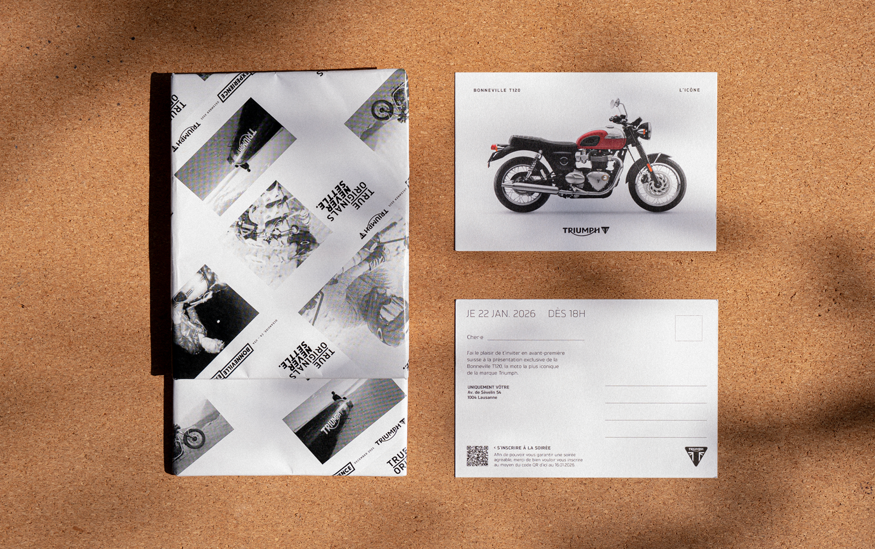 Triumph nous a confié la conception et la coordination de la production de ses cartons d’invitation pour un événement privé, destiné à valoriser son modèle emblématique : la Bonneville T120.